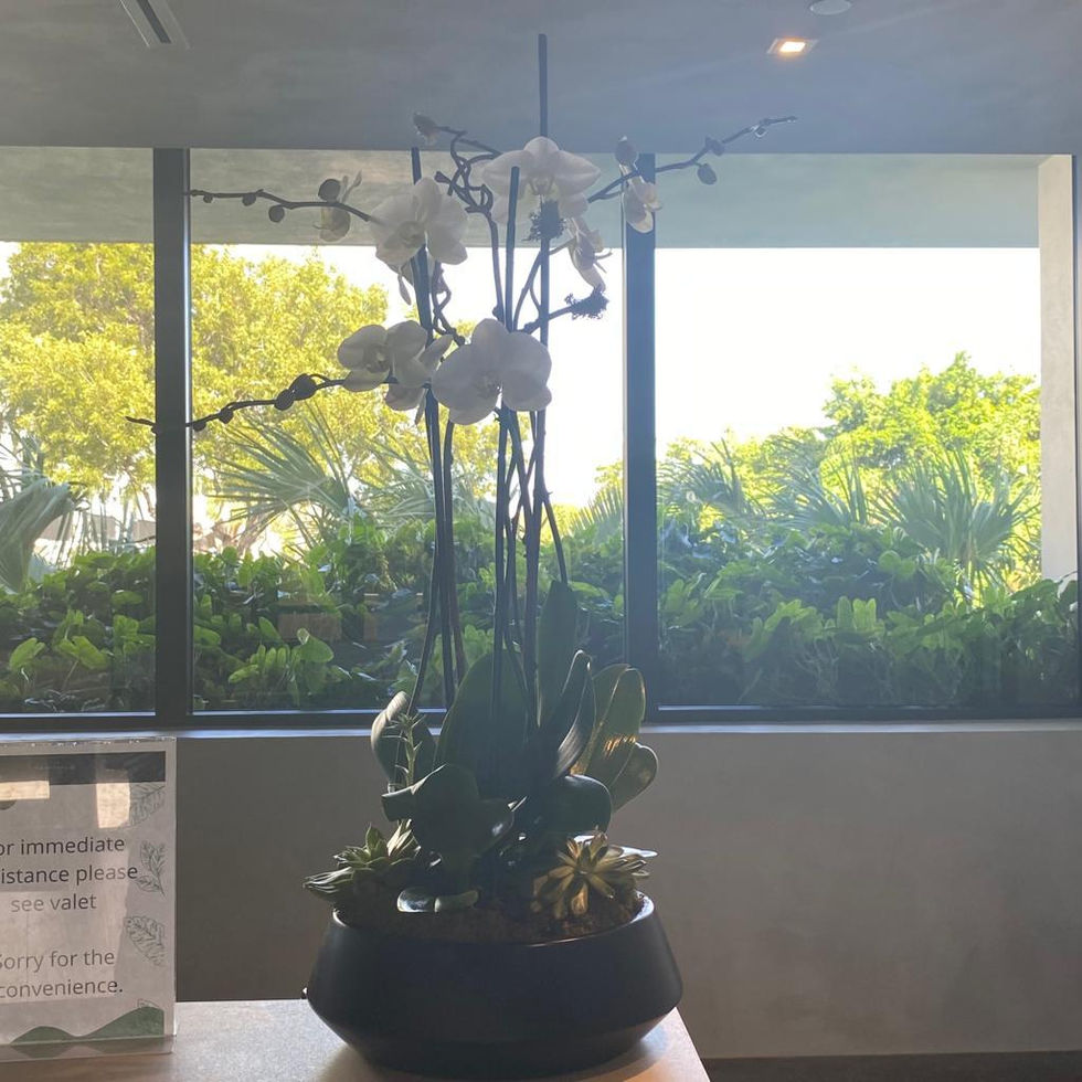 This project features modern indoor settings with orchid arrangements, including a wooden wall niche, a modern living room, and a glass coffee table. The images capture the contemporary and stylish nature of these floral displays.